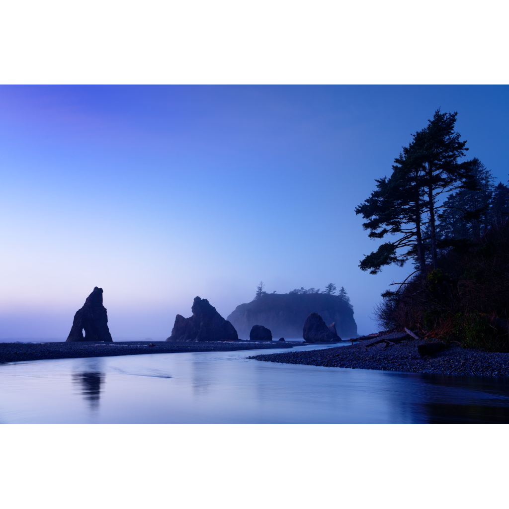 I made this image on a mid-January evening in the “purple light” that follows sunset. A 5 second exposure smooths out the water in Cedar Creek, giving it a calm and peaceful feeling. Sea stacks reflect in Cedar Creek and are in silhouette against a light mist of ocean spray.
