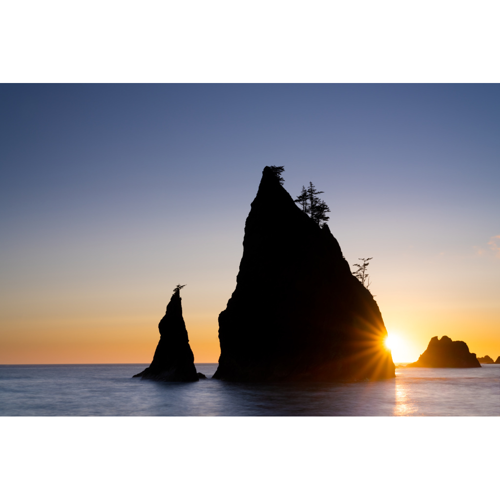 I made this image on a summer evening with just a sliver of the sun peeking around the side of the sea stack. An aperture of f/14 creates a flare effect within my lens to add a bit of “starburst” to the sun.
