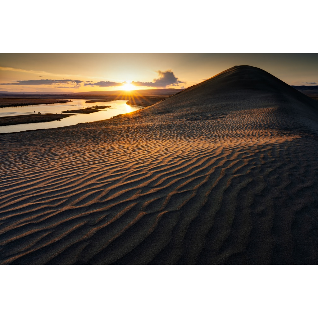 Last rays of daylight reflect off the river and graze across ripples of sand on this dune overlooking the Columbia River’s Hanford Reach.
