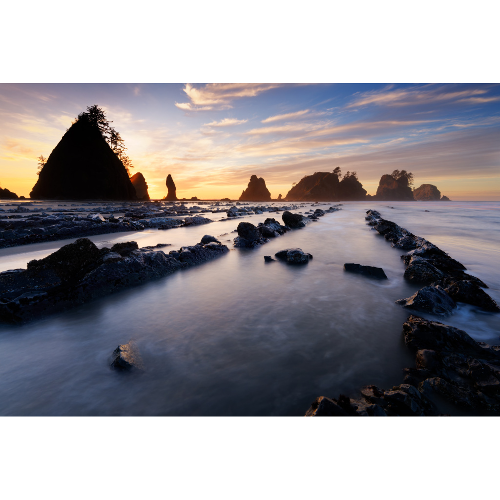 Off-shore sea stacks tell a story of wind and water erosion along the northern 85 miles of Washington’s Coast. The sea stacks off this rocky shoreline are near the northern end of the Washington Coast in Olympic National Park.