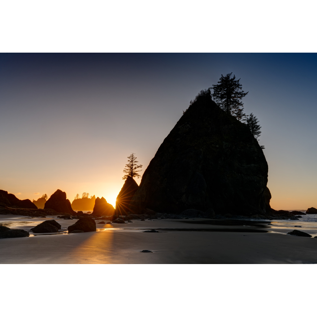 While this beach is over-run during summer months, I made this image on a beautiful (though cold) mid-January evening and had the beach all to myself. Warm light from the setting sun pours through gaps in the sea stacks and reflects off the sand.