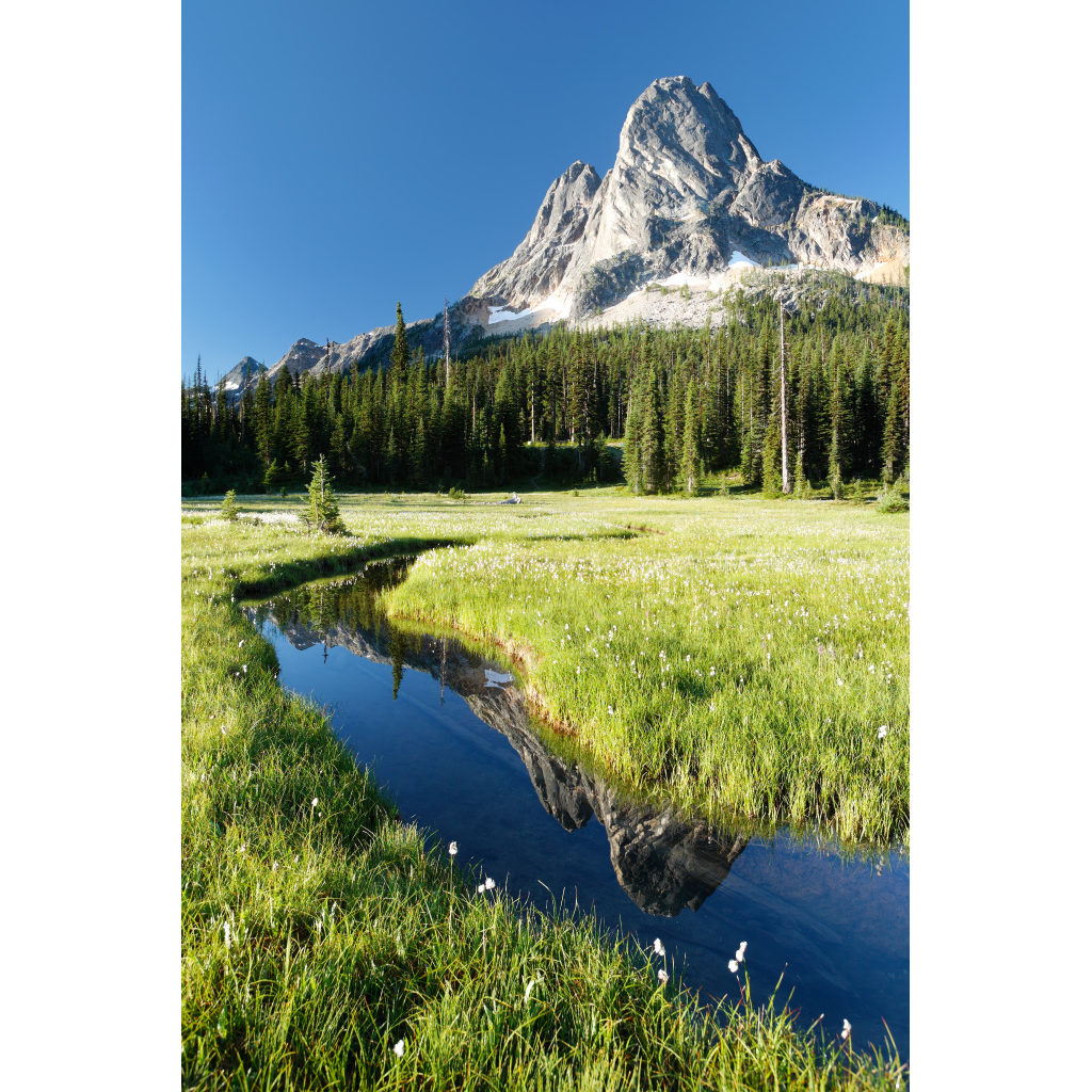 Here, the mountain is reflected in a small creek with little wildflowers in early-summer.